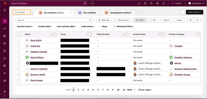 On the left-hand panel of HubSpot, there is a series of icons. The “address book” icon is the CRM menu option, where you can click in to check out the contacts records index page, which is a spreadsheet view of anyone that could be connected to Orchestra: