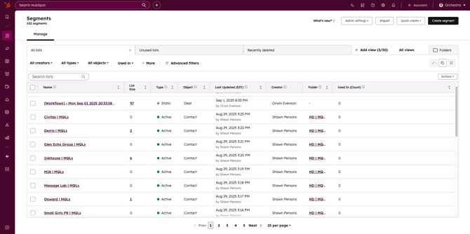 Groups of contact and company records can be sorted into two types of lists: active segments and static segments. Static segments are automatically added whenever contacts are uploaded onto HubSpot. These are records that meet defined criteria during that specific period of time, and thus do not update automatically. Active segments automatically update whenever contact record data that meets the criteria for the list enters HubSpot.